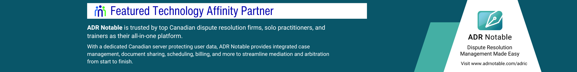 ADR Notable is proud to be an ADRIC Featured Technology Partner! Offering a unique cloud-based case and practice management solution, we help individual practitioners and firms of all sizes streamline their workflow, managing everything from scheduling, billing, document management, and soon, digital signing, all in a single platform.
